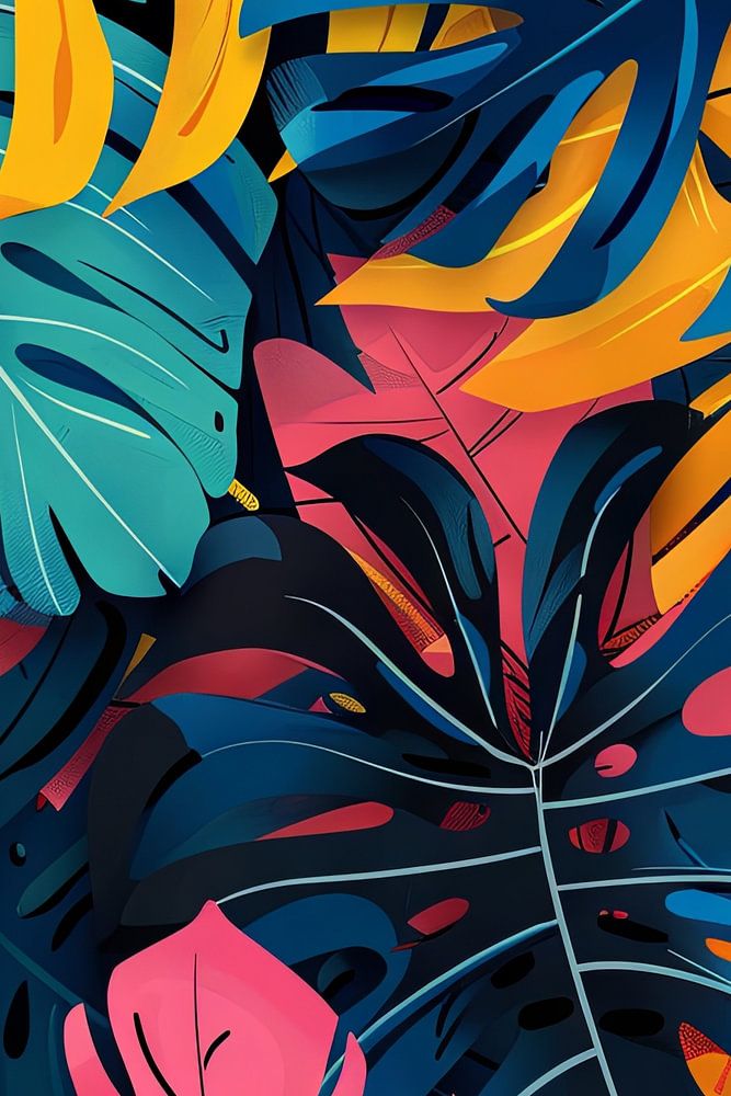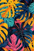 Deze kunstdruk toont monsterabladeren in een abstracte en kleurrijke compositie. De levendige roze, oranje en blauwe tinten geven het kunstwerk energie en creativiteit. De dynamische opstelling van de bladeren en het kundige gebruik van kleuren en texturen geven deze print een expressieve en moderne uitstraling. Dit ontwerp is ideaal voor residentiële of commerciële ruimtes die op zoek zijn naar een gedurfd accent en zal iedereen aanspreken die houdt van een artistieke en levendige sfeer in hun omgeving.