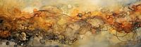 Abstract Natuur - Met zijn warme aardetinten en organische vormen biedt dit panoramische schilderij een abstracte interpretatie van natuurlijke processen. De sierlijke, zwarte lijnen lijken als ranken door een zonovergoten landschap van vloeiende vormen en bubbels te dansen, wat een levendig en toch harmonieus geheel schept.
