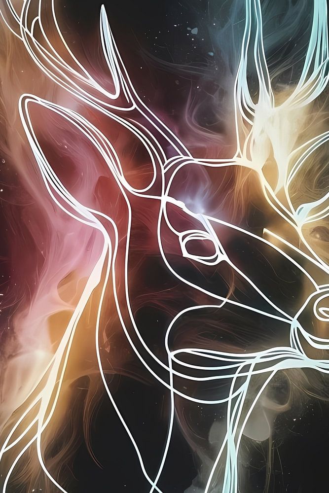 Dit artistieke meesterwerk brengt de schoonheid van de natuur samen met het oneindige van het universum in een moderne fusie. Het ontwerp toont een majestueus hert omlijst door levendige neon lijnen, alsof het energie uit de kosmos zelf put. De achtergrond is een zee van sterren, subtiel maar indrukwekkend, wat een diepte en mysterie aan het stuk toevoegt. De abstracte vormen en kleuren brengen een gevoel van beweging en leven, alsof het hert op elk moment van de muur zou kunnen springen. Dit kunstwerk is een ode aan zowel de moderne digitale kunst als de eeuwige charme van de natuur en zou een unieke toevoeging zijn aan elke moderne woon- of werkruimte die verlangt naar een vleugje kleur en inspiratie.