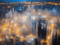 "Ervaar de stedelijke pracht in al zijn glorie met dit prachtig vervaardigde kunstwerk. De levendige impasto-techniek brengt de textuur van gebouwen tot leven, terwijl abstracte elementen een mysterieuze diepte toevoegen aan het nachtelijke landschap. Met bedachtzaam gebruik van de dry brush-techniek worden de lichten van de stad subtiel geaccentueerd, waardoor een betoverend schouwspel van schaduwen en glinsterende lichtjes ontstaat. Deze hemelse weergave van een stad bij nacht brengt een unieke sfeer in elke ruimte.