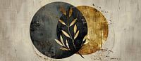 Dit abstracte ontwerp toont twee overlappende cirkels in goud en grijs, met een elegante silhouet van een tak met bladeren. De achtergrond heeft een textuur die diepte aan de compositie toevoegt. De gouden cirkel ligt iets hoger dan de grijze omgeving, wat een gevoel van textuur en beweging op het canvas creëert.