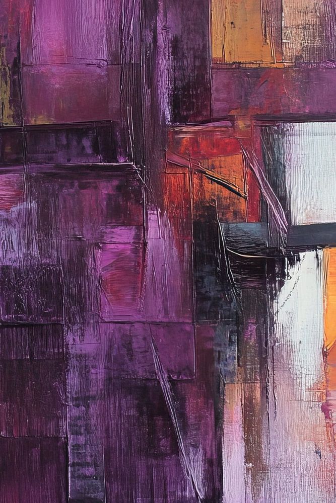 Abstract Paars Contrast - Dit abstracte schilderij bevat een dynamische compositie van paarse en oranje vlakken en lijnen op een overheersend paarse achtergrond, waardoor het gevoel wordt opgewekt van beweging en diepte door contrasterende kleuren en texturen.