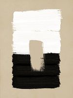 Een abstracte print met neutrale kleuren. De achtergrond heeft een mooie warme kleur. Daar boven op twee zwart en wit digitaal geverfde vormen. De verfstreep met dezelfde kleur als de achtergrond maakt het geheel af.