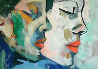 Abstract Portret | Abstract Gezicht - In dit abstract portret schilderij zie je twee gezichten dicht bij elkaar, met opvallende kleurvlakken in groen, blauw en oranje, die samen een modern en minimalistisch effect creëren.