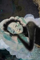 Dit kunstwerk, met zijn fascinerende samensmelting van abstracte vormen en een zacht portret van een vrouw, speelt met de verbeelding en nodigt de kijker uit tot een moment van bezinning. De vrouw, opgegaan in haar gedachten, wordt omhuld door een droomachtige sfeer waarin de grenzen tussen realiteit en fantasie vervagen. De monochrome tinten, punctueel onderbroken door subtiele kleuraccenten, geven het stuk een tijdloze uitstraling. Dit stuk zou een pronkstuk zijn in elke moderne inrichting, waar het gesprekken uitlokt en de kijker verleidt tot introspectie.