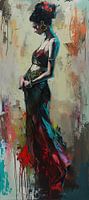 Abstract Portret - Dit dynamische schilderij mengt de energie van street art met een klassiek portret, waarbij een elegante gestalte in een wervelwind van kleur en textuur staat. De expressieve penseelstreken en spatten van rood en blauw brengen een levendigheid die contrasteert met de ingetogen pose van de figuur. Het is een boeiend…
