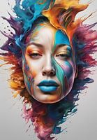 Op dit kunstwerk zie je een abstract gezicht dat omgeven is door een explosie van kleuren en vormen. De kleuren vloeien naadloos in elkaar over, wat een dromerig effect creëert. Unieke elementen zijn de subtiele kleurveranderingen en de manier waarop de kleuren lijken te dansen rond de gelaatstrekken.