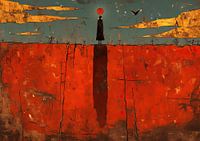 Abstract Rood | Red Monolith Dreams - Dit abstracte schilderij toont een solitaire figuur met een felle rode bol als hoofd, staande op een rood getinte klif met een barre, gele achtergrond en een vliegende vogel.