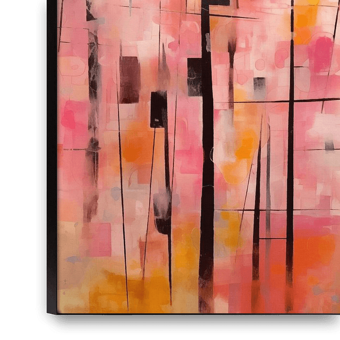 'Abstract Roze Spectrum' is een visueel feest van vorm en kleur, opgebouwd uit lagen van roze en oranje tinten, doorsneden door donkere lijnen die zowel diepte als structuur bieden. De variatie in tinten en de overlappende lijnstructuren roepen de complexiteit en veelzijdigheid van stedelijke landschappen op