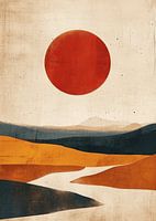 Dit kunstwerk toont een abstracte interpretatie van een landschap met een opvallende rode zon tegen een getextureerde achtergrond. Het beeld is opgebouwd uit gelaagde heuvels met een beperkt kleurenpalet van oranje en okertinten, wat bijdraagt aan een gevoel van warmte en kalmte. De stijl is modern en strak, met een duidelijke abstracte…