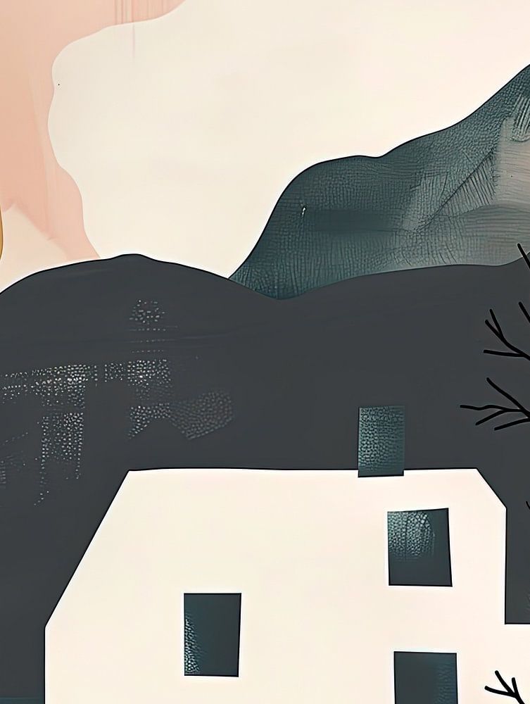 In het midden van de compositie staat een eenvoudig, wit huis met strakke lijnen, zonder overbodige details, omringd door abstracte vormen die bomen voorstellen. De linker boom heeft een warme, beige tint, terwijl de rechterboom donker en kaal is, wat een gevoel van seizoenverandering oproept.