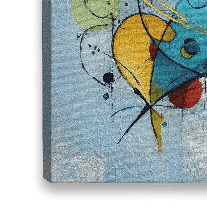 Dit abstracte schilderij in blauw, geel en oranje met speelse geometrische vormen voelt vrolijk en modern aan. De levendige compositie brengt energie en optimisme en geeft elke ruimte een frisse uitstraling.