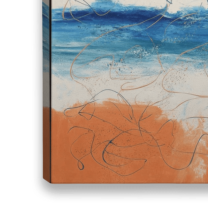 Dit blauw en turquoise abstract schilderij met luchtige lijnen en zachte strandtinten voelt dromerig en modern aan en brengt een frisse, ruimtelijke sfeer in je interieur. De combinatie van luchtige beweging en warme oranje accenten geeft het werk zowel rust als levendigheid. Mooi passend in Scandinavische, Bohemian, Eclectische en…