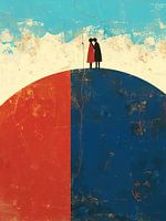 Abstract Schilderij | Colors of Connection Sphere - Dit abstracte schilderij toont twee mensen op de top van een groot halfrond, geaccentueerd door diepe rode en blauwe kleuren met subtiele krassen en texturen.