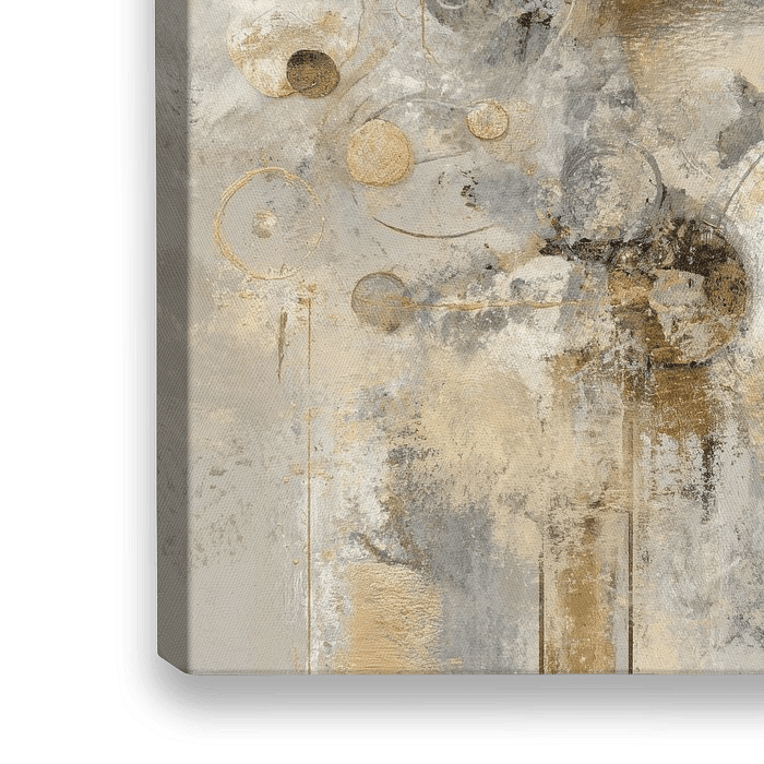 Dit goud en grijs abstract schilderij met cirkelvormige structuren en verfijnde texturen voelt mysterieus en elegant aan en brengt een subtiele luxe in je interieur. De gelaagde vormen en zachte metallic accenten zorgen voor diepte en een tijdloze uitstraling. Mooi passend in Grandeur Chique, Modern Chic, Japandi en Wabi-Sabi interieurs…