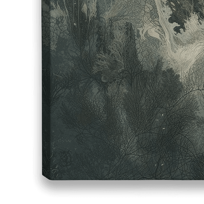Abstract Schilderij | Hidden Floral Universe - Dit abstracte schilderij presenteert een verbluffende compositie van organische texturen en patronen, waarbij de verscheidenheid aan vormen en structuren doet denken aan flora en microscopische organismen. Centraal in het beeld zien we een wirwar van delicate, bloemachtige vormen en texturen, variërend van gedetailleerde filigraanachtige tekeningen tot solide, schimmige gebieden. Het kleurenpalet is gelaagd en complex, met tinten van grijs, blauw, goud en groen die naadloos in elkaar overvloeien en een dromerige, bijna onderwaterachtige sfeer creëren. De gouden accenten voegen een subtiele schittering toe, die de aandacht naar verschillende delen van het schilderij leidt. Dit abstracte kunstwerk wekt een gevoel van mysterie en ontdekking op, alsof je door een vergrootglas kijkt naar een onbekende, prachtige natuur.