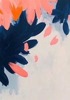 Een close-up van een abstract schilderij met grote penseelstreken in marineblauw, koraalroze en wit, waardoor gedurfde vormen ontstaan die doen denken aan bloemen of bloemblaadjes. De achtergrond is effen lichtgrijs en contrasteert met de felle kleuren. Een zachte schaduw valt over een deel van het doek en geeft diepte aan het beeld…