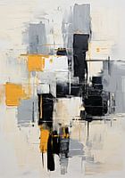 Abstract schilderij in zwart, wit, grijs en oranje.