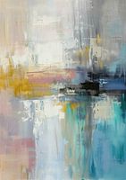 Abstract Schilderij | Reflection Mirage - Dit abstracte schilderij betovert de kijker met zijn levendige samenspel van kleuren en vormen, die samen een dynamisch, bijna vloeibaar canvas creëren. Centraal in het beeld staan de grote vegen van wit en blauw die doen denken aan de reflectie van water of een mistige lucht, terwijl roze en oranje tinten warmte toevoegen aan het onderste deel van het schilderij. Donkere horizontale lijnen suggereren een vage horizon, waarbij de reflecties en verschuivingen in de schilderstijl de grenzen van water en lucht doen vervagen. De gebruikte techniek is los en expressief, met zichtbare penseelstreken die de textuur en beweging binnen het werk versterken.