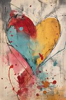 Dit abstracte schilderij in rood, geel en turquoise met expressieve hartvormen voelt krachtig en dynamisch aan. De energieke penseelstreken en kleurrijke contrasten brengen passie en levendigheid in elke ruimte.