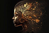 Een prachtige vrouw, gehuld in gouden tinten, haar brein een wonderbaarlijke creatie van bloemen en goud. Dit abstracte kunstwerk is een ware inspiratie voor iedereen die verlangt naar rijkdom en overvloed in het leven.