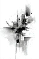 Dit zwart-wit abstract schilderij met geometrische vormen en architecturale lijnen voelt mysterieus en verfijnd aan.
