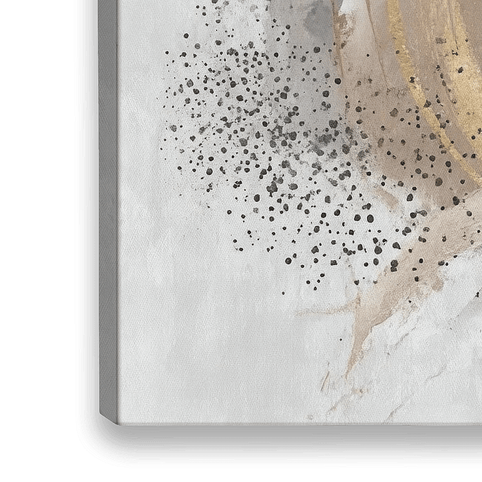 Dit goud en taupe abstract schilderij met een grote metallic cirkel, zachte waaiervormen en fijne spetters voelt elegant en modern aan en geeft stijlvolle verfijning aan je interieur. De combinatie van organische penseelvlakken, zwarte accenten en transparante lagen brengt rust, balans en een gevoel van harmonie. Mooi passend in…