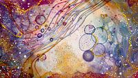 Abstract schilderij, in de kleuren paars, goud en blauw.