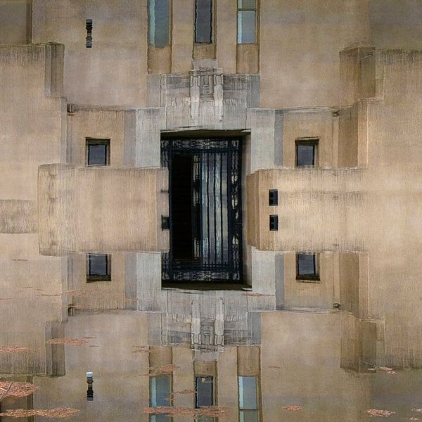 Deze foto maakte ik op de Veluwe van radio Kootwijk. Het is de spiegeling van het gebouw in de vijver ervoor en dan opnieuw maar omgedraaid. Deze beide foto's zijn aan elkaar gezet via lagen dus eigenlijk betreft het een collage van twee foto's.