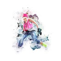 Abstract dans muziek aquarel schilderij met een hip hop dansende vrouw in felle kleuren.