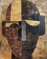 Dit werk uit de Tribal Masks-serie toont een gestileerd gezicht dat is opgebouwd uit grote vlakken in goud, bruin en zwart. De verticale verdeling en het subtiele spel van licht en schaduw geven het portret een gevoel van balans en dualiteit. De combinatie van ruwe structuren en glanzende accenten maakt het werk zowel sober als luxueus.