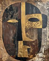 Dit abstracte portret uit de Tribal Masks-serie toont een krachtig gezicht opgebouwd uit diepe bruin- en zwarttinten, aangevuld met warme gouden accenten. De verticale lijn die het werk in twee helften verdeelt, versterkt het gevoel van balans en dualiteit, terwijl de asymmetrische ogen het kunstwerk een mysterieus en spiritueel karakter geven.