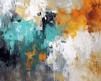 Abstract Turquoise | Turquoise Contrast Energie - Dit expressieve kunstwerk betrekt je met zijn levendige abstracte compositie, waarbij de tegenstelling tussen de koele turquoise tinten en de warme oranje en okergele kleurschakeringen een dramatisch maar harmonieus geheel vormt. De energieke verfstreken en de suggestie van verval door het gebruik van patina-achtige effecten voegen diepte en textuur toe, terwijl de witte en grijze elementen een modern, fris gevoel aan het schilderij geven.