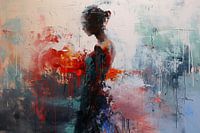Abstract Urban Art - Met een levendige fusie van rood en blauw dat het canvas in vuur en ijs doet opgaan, nodigt dit stuk de toeschouwer uit tot een spel van interpretatie. De gestalte van een vrouw vormt het rustpunt binnen de dynamiek van de abstracte penseelstreken, terwijl textuur en contrast een tastbare sensatie toevoegen aan dit urban landschap.