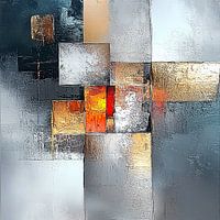 Abstract Vierkant - Dit abstracte schilderij toont een dynamische compositie van overlappende vierkanten en rechthoeken, waar schakeringen van grijs, zilver en goud de achtergrond domineren, doorbroken door een levendige, oranje gloed in het midden die een gevoel van warmte uitstraalt.
