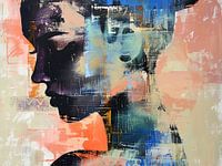 Abstract Vrouw Met Kleur - Op dit abstract portret schilderij zie je een vrouwelijke silhouet met verschillende kleuren en texturen, waar de nadruk ligt op een combinatie van zwart, blauw en zachte tonen die het gezicht en de schouders benadrukken.