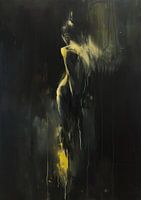 Details: abstract, kunst, menselijke figuur, donker, zwart, geel, goud, expressief, dramatisch, mysterieus
