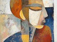 Abstract Vrouw - Dit is een abstract schilderij met een vrouwlijke figuur die in profiel is afgebeeld, waarbij warmte en kou elkaar tegenkomen door het gebruik van oranje, grijs en blauw, met opvallende vormen en lijnen die de moderniteit van het portret benadrukken.