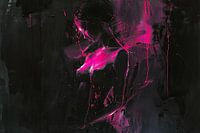 Abstract Vrouwen Schilderij - Dit abstracte vrouwen schilderij is gevangen in een levendige en dynamische compositie die emotie en beweging uitstraalt. Het hoofdonderwerp, een menselijke figuur, een vrouw, staat centraal binnen een donkere, bijna monochrome achtergrond die grotendeels bestaat uit zwart en donkergrijze tonen. Het kernpunt van het schilderij, dat onmiddellijk de aandacht trekt, zijn de intense neon roze lichten die lijken te stralen vanuit het silhouet van de vrouw, waardoor een indruk van interne gloed of kracht ontstaat. Deze lichten vormen abstracte stroken en spetters die naar buiten toe uitstralen, waardoor het effect van een explosie of ontploffing wordt gecreëerd, wat een gevoel van beweging en krachtige energie aan het schilderij toevoegt. De toepassing van de verf is rauw en expressief, met zichtbare penseelstreken en druipvlekken die de textuur en diepte van het kunstwerk verhogen.