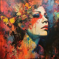 Details: vrouw, portret, abstract, rood, blauw, oranje, zwart, bloemen, vlinders, urban, Pop of Colour
