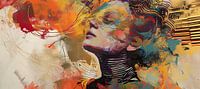 Abstract Vrouwenportret | Verstrengeling - Dit ingrijpende stuk vermengt abstractie met figuratieve nuances, waar een vrouwengezicht haast oplost in een werveling van gouden en oranjerode tinten. De stijl flirt met street-art invloeden, terwijl de gelaagde textuur en dynamiek een urban edge geven. De punctuaties van fris turquoise en diepblauw voegen een verfrissende diepte toe aan het warme kleurenpalet.