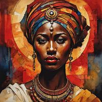 Dit schilderij toont de tijdloze kracht en schoonheid van een zwarte Afrikaanse vrouw, weergegeven in een schilderachtige stijl die zowel vorm als geest viert. Krachtige penseelstreken geven vorm aan haar figuur met expressieve vitaliteit, terwijl zachtere mengingen diepte en warmte creëren en de aandacht vestigen op de waardigheid in haar houding en de sereniteit van haar uitdrukking. De schilderkunstige benadering geeft het portret een bijna tastbare kwaliteit, waarbij textuur en beweging lijken te leven op het oppervlak, waardoor het kunstwerk zowel intiem als groots aanvoelt. Haar aanwezigheid straalt een stille veerkracht uit, die niet alleen haar uiterlijke verschijning vastlegt, maar ook de essentie van culturele trots en innerlijke gratie.