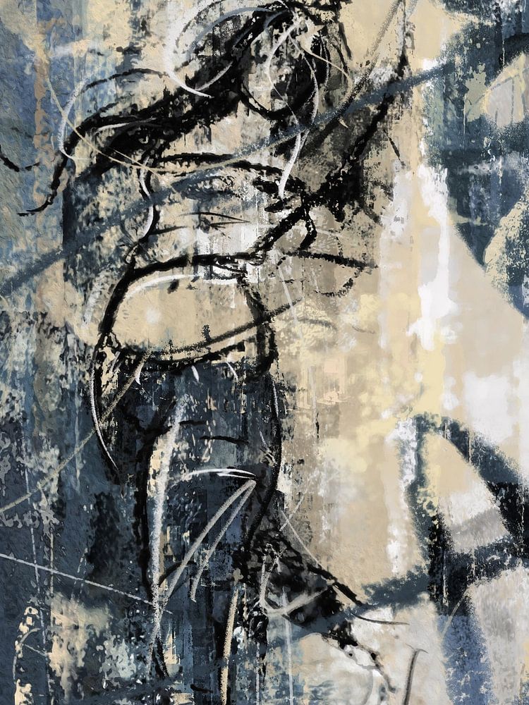 Abstract kunstwerk van een danseres. Werk gemaakt met houtskool en digitaal bewerkt in blauw en geel.
