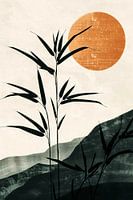 Dit stijlvolle en minimalistische ontwerp combineert de rust van de natuur met een modern esthetisch gevoel. Het toont elegante silhouetten van bamboestengels en bladeren, versterkt door een warme oranje zon die boven abstracte groene heuvels hangt. De subtiele kleurtonen en eenvoudige lijnen maken het een perfecte aanvulling op elk interieur, van Japandi-stijl woonkamers tot moderne kantoren. Dit kunstwerk straalt balans en harmonie uit, ideaal om een serene sfeer in je ruimte te creëren.