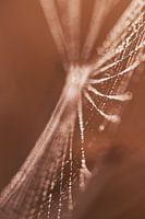 Een spinnenweb met een zeer beperkte scherptediepte gefotografeerd, dus met veel onscherpte. De warme kleur op de achtergrond wordt veroorzaakt door de zonsopkomst.