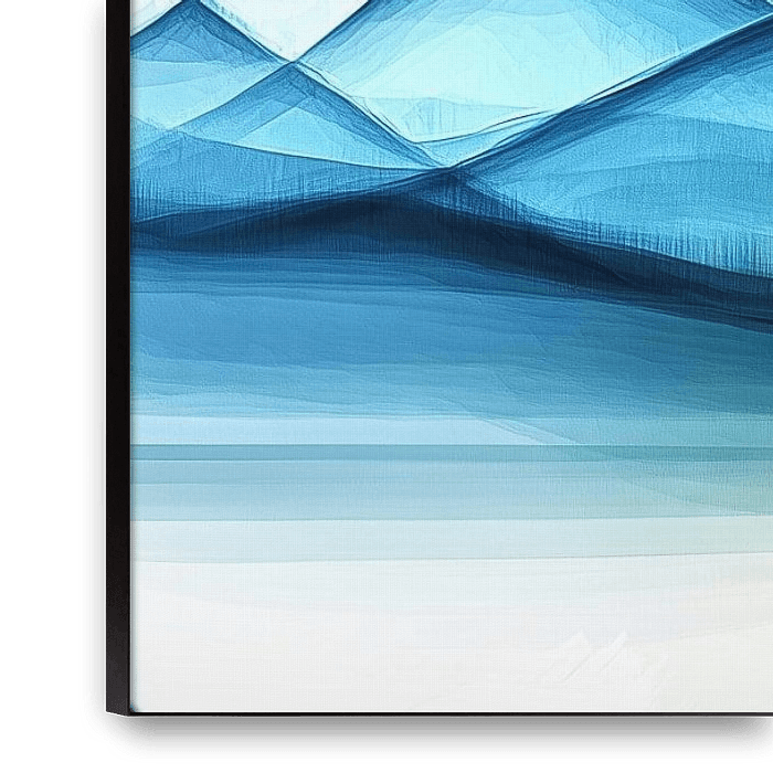Een abstract schilderij toont levendige, kleurrijke bergtoppen die zachtjes overgaan in een zachte witte achtergrond. Deze compositie creëert een kalme en dromerige sfeer die sereniteit en uitgestrektheid uitstraalt.
