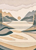 Abstract berglandschap met meren – minimalisme (1) in pasteltinten goud, grijs en taupe is een digitale illustratie.