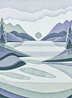 Abstract berglandschap met meren – minimalisme (4) in pasteltinten lichtgroen, grijs en lila is een digitale illustratie.