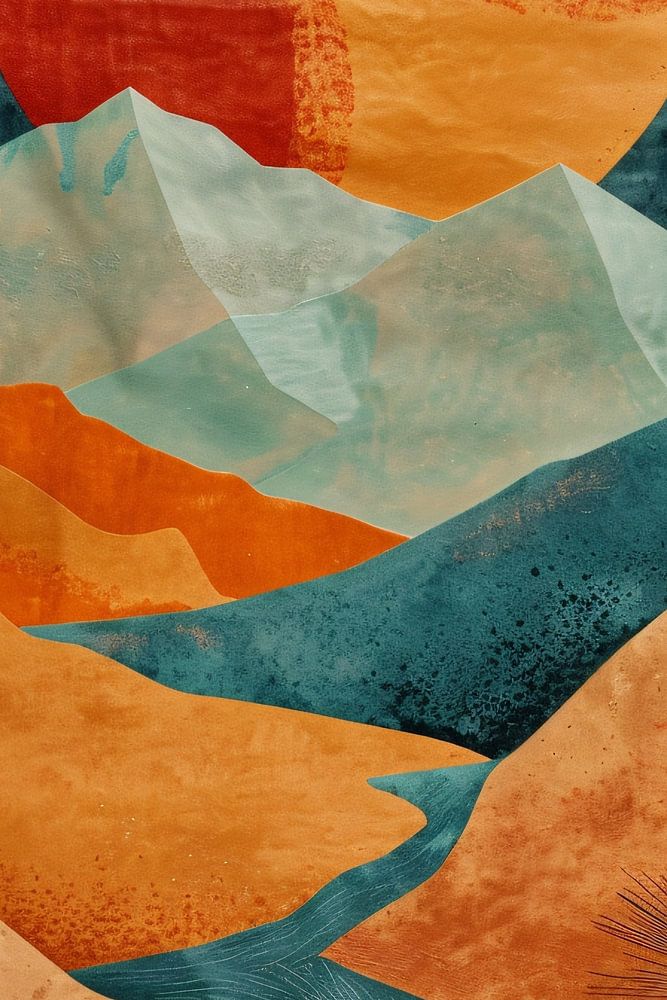 Dit prachtige kunstwerk toont een surrealistisch berglandschap met een majestueuze zon die boven de horizon uittorent. De combinatie van warme tinten zoals oranje, rood en geel met koele blauwen en groenen geeft een unieke sfeer. De zachte vormen van de bergen vloeien harmonieus over in de kronkelende rivier die door de valleien snijdt. Dit kunstwerk is perfect voor moderne interieurs die verlangen naar een vleugje natuur met een abstracte twist. Het ontwerp creëert rust en sereniteit, ideaal voor ruimtes zoals een kantoor of slaapkamer, waar een kalmerende ambiance belangrijk is. Een stijlvolle keuze voor liefhebbers van moderne en abstracte kunst.