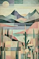 Abstract berglandschap met zon en planten in pastelkleuren. De grote zon staat hoog aan de hemel. Het is zomer. De planten rijzen als grote sprieten uit het dal.